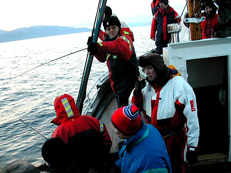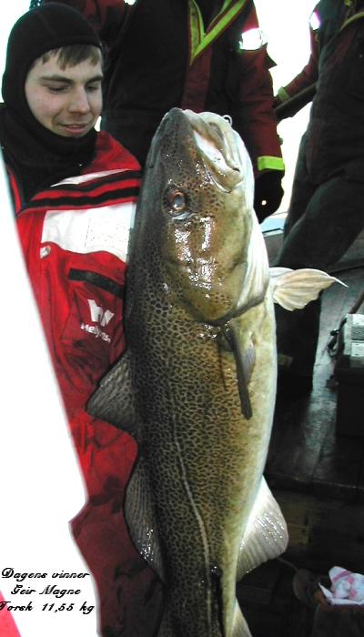 Siste tur i vanlig fiske skulle avvikles og 15 deltagere møtte opp på Skansen. Vi skulle alle på samme båt, og siden 4 mann hadde mulighet til å vinne Seriemesterskapet, lå det an til å bli litt av et rotterace. Plasser ble trukket og etterpå bar det ut til ”Mefjordgrunnen”. Været var bra og fiske var normalt til å være i Trondheimsfjorden i desember. Svein Erling som ledet før siste tur , fisket fortsatt godt og gliste fra øre til øre etter hvert. Etter 2,5 times fiske tok vi en pause for å spise lappskaus og bytte plasser om bord. Dette ble gjort ved at vi roterte 5 plasser. Så alle skulle få så jevne forhold som mulig. Noe som fungerte utmerket. Etter pausen tok vi fatt på den siste halvdelen av fisketiden. Etter hvert ble vi oppmerksomme på voldsomt mye røyk fra midtbyen. På med radioen i båten: Det viste seg selvsagt å være fra bybrannen som da ble det store samtaleemne. Fisket var likedan som tidligere på dagen og Svein Erling lå godt an til å vinne klubbmesterskapet i vanlig fiske. Men da det gjenstod bare 20 minutter av fisketiden….PANG……Det hugg på voldsomt til undertegnede og snøret raste ut. Dette var noe stort. Fisken hadde flere voldsomme utras, og oppførte seg snedig. Alle mann måtte dra opp, da fisken gikk i ring rundt båten, Den var ikke enkel å handtere med det lette utstyret jeg hadde. Men etter hvert kom den da opp, en diger torsk, krøkt i spolen. P.S. Lappskausen var god syntes Ole Martin. |