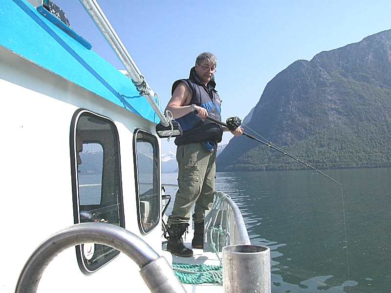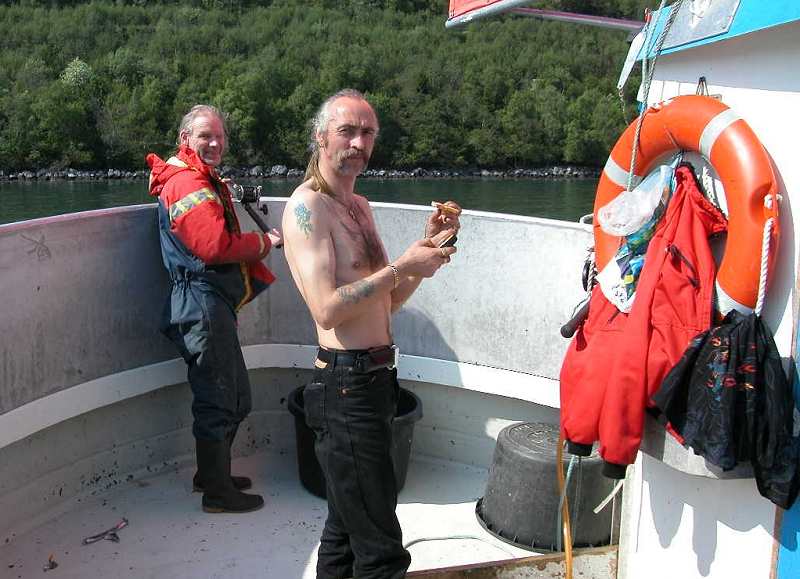 Været var ganske bra og båtføreren oppsøkte sine favorittplasser. Det var mye fisk å se på ekkoloddet, men når alle fiskerne slapp ned pilkene sine og begynte å fiske så forsvant fisken fort. Fisken var sky og når vi fisket vanlig så det ut til at det ble for mye forstyrrelse og fisken forsvant med en gang. Dette gjentok seg på plass etter plass og vi var veldig i tvil om hva vi skulle gjøre. På lørdag ettermiddag hadde Ståle Måntrøen fisket fra land i osen på elva Måna. Dette er ei lakselv men Ståle hadde fått flere seier og vi bestemte oss derfor for å prøve å fiske der. Da vi kom fram til osen så fiskeskipperen mye fisk på ekkoloddet. Det var så grunt og vannet var klart nok til at det gikk an å se noen fisker også uten ekkolodd. Fiskeskipperen så flere store lakser som svømte forbi. Det var derfor mange spente fiskere som begynte å pilke. Vi lå litt på siden av elveosen i svak strøm på 8-10 m dyp. Nå fikk vi endelig fisk. Det ble ikke tatt noen laks og de fiskene som kom om bord var heller ikke store. En fisk på 1,7 kg ga førsteplass, mens han som kom på andreplass fikk to fisker på til sammen 1,65 kg. Jeg går ut fra at dette må være i nærheten av minimumsrekord når det gjelder vanlig fiske.