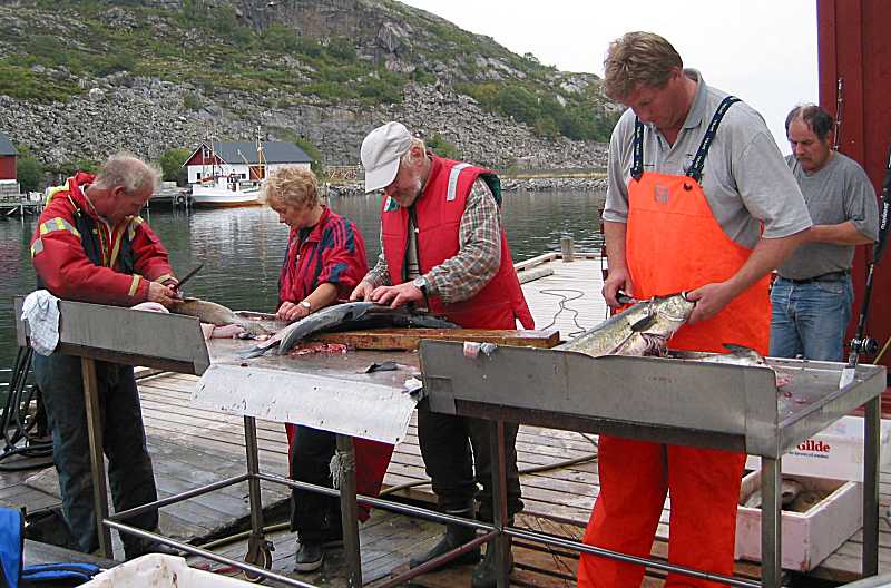 Referat fra havfisketur i Osen 4.september 04 - Vanlig 7 14 sjeler fra Trondheim havfiskeklubb (og omland) frekventerte Vingsands rorbuer med storfisk i blikket. Stedet er fortreffelig med alt hva et fiskerhjerte begjærer: Utmerkede rorbuer på kaia,, kjølelager, ismaskin, og butikk som er åpen når du trenger noe. Båtene varierte i størrelse fra 26 til en 70 fots shelterdekker som den nye eieren hadde reddet fra kondemnering. Undertegnede var en av ti stykker på sistnevnte. Været var upåklagelig. Skipperen som var fra Roan , la lystelig i vei mot sin hjemmebane med en gruppe som var lykkelig og uvitende om det slit som lå foran oss. Det må vel nevnes at om bord var det ei salig blanding av fiskere fra Oslo og Trondheim havfiskeklubber, samt noen med en fot i hver leir. Det skulle vise seg at storseien var tilstede, og med breisida til sto samtlige i lo og lo etter hvert som den ene storseien etter den andre ble manøvrert inn til skutsida for klepping. Avstanden ned til sjøen var vel kanskje 5 meter , så vanlige klepper kom til kort. Periodevis måtte skipperen springe mellom fiskerne for å bistå med spesialkleppen. Foruten kassevis med sei, ble det tatt en del brosme, lyr ,uer og noen torsker påbåten. Detaljer om det vises på resultatlisten. Det må vel nevnes at Lars fra Oslo av noen grunn fikk slitt av snøret . Sigurd fisket iherdig nærmest ham og rotet seg bort i noe tungt og rart. Dette skulle etter hvert vise seg å være snøret til Lars med to storseier på. Jeg mener Torun sa hun hadde 25 storseier. Min sidemann fylte nærmere 3 kasser med fisk . Selv var jeg fornøyd med å ha fylt to kasser. Gunder tok ei brosme som knekte stanga hans enda den var forsterket på midten. (Slik kan det vel også sies.)Tilbake på kaia var det tydelig at alle hadde fått sin del av et eventyrlig fiske. For oss i Trondheim havfiskeklubb vil resultatlista ikke fortelle hele sannheten om denne opplevelsen ettersom bare største fisk teller, men minneverdig var den. Ref. Kåre Sandvik |