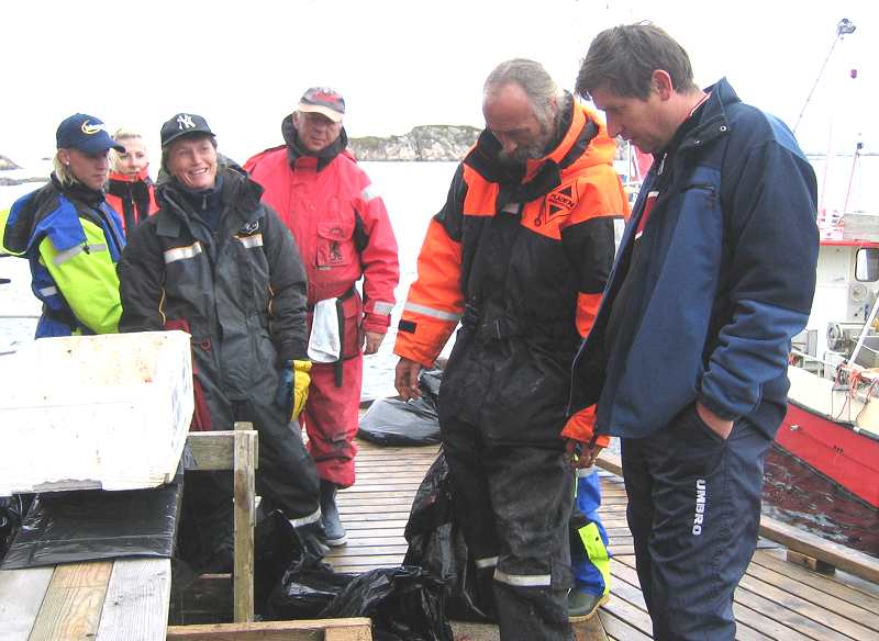 Vi våknet etter en ny natt på "barnehagen", som forøvrig er en utmerket plass å bo på. Trøtt var det ingen grunn til å være, for utror var ikke før kl. 10.00,men så var det dette med å legge seg i rett tid da, og det er nok lettere sagt enn gjort. Vi hørte på lyden at det ble fiske innaskjærs i dag og, vinden ulte rundt veggene, og skua vi utoverhavet gikk sjøsprøyten høyt over skjæra. Men pytt ,ingen sure miner for det, fiske skulle vi. Jeg hadde trukket Audun som båtfører, noe som vanligvis tilsier bra fangst. Men akk, fangsten vi fikk i løpet av de 5 timene vi fisket, er vel ingenting å skrive heim om, det skulle heller vert tatt video av alle de akrobatiske øvelsene hver enkelt fisker måtte utføre for å holde seg på fotan og ikke deise over bord.Den som hadde mest utbytte av turen var kanskje krabben, og han begynner vel å bli kresen etter hvert, for det siste han fikk servert var portvin, så hva skal vi stille med neste gang ?. Men fangst eller ikke fangst, det viktigste er vel å komme på en trivelig plass, og treffe trivelige folk, og det ønske fikk forhåpentligvis de fleste oppfylt. (Ref.: Finn Larsen)